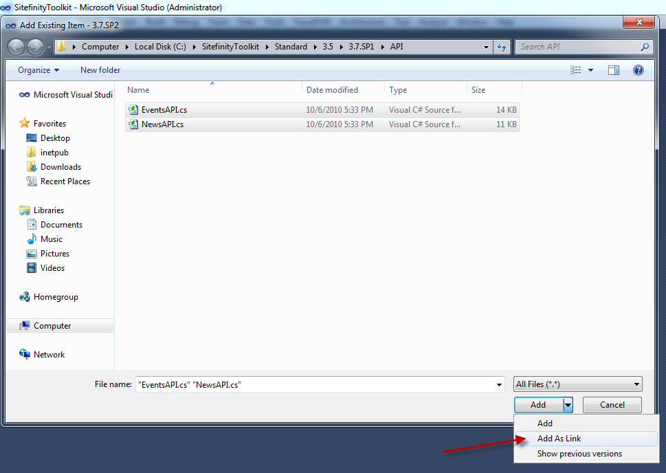 Now you may be thinking that managing 22 copies of source code is a nightmare and you would be absolutely right. Fortunately, Visual Studio has an excellent feature that allows you to "link" to existing source code files so that there is only ONE copy of the source file. This link can be shared to any number of projects, including our 22 Sitefinity projects!