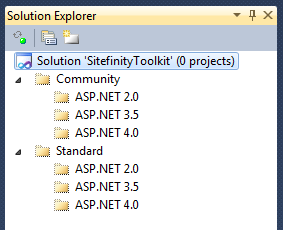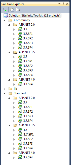 As I mentioned in my recent post announcing the Sitefinity Toolkit 1.2, adding support to all of the different platforms and versions for Sitefinity 3.7 was an interesting challenge. In the end it required a total of 22 projects (one for each version/platform) organized into one solution. Today I'm going to walk you through the process I took in setting this solution up.